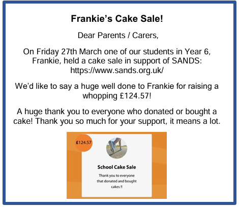 A Big Thank You – We would like to thank the Beach Class families for raising £37.00 for Macmillan from our share afternoon. Thank you for your kindness and for helping support a wonderful charity.